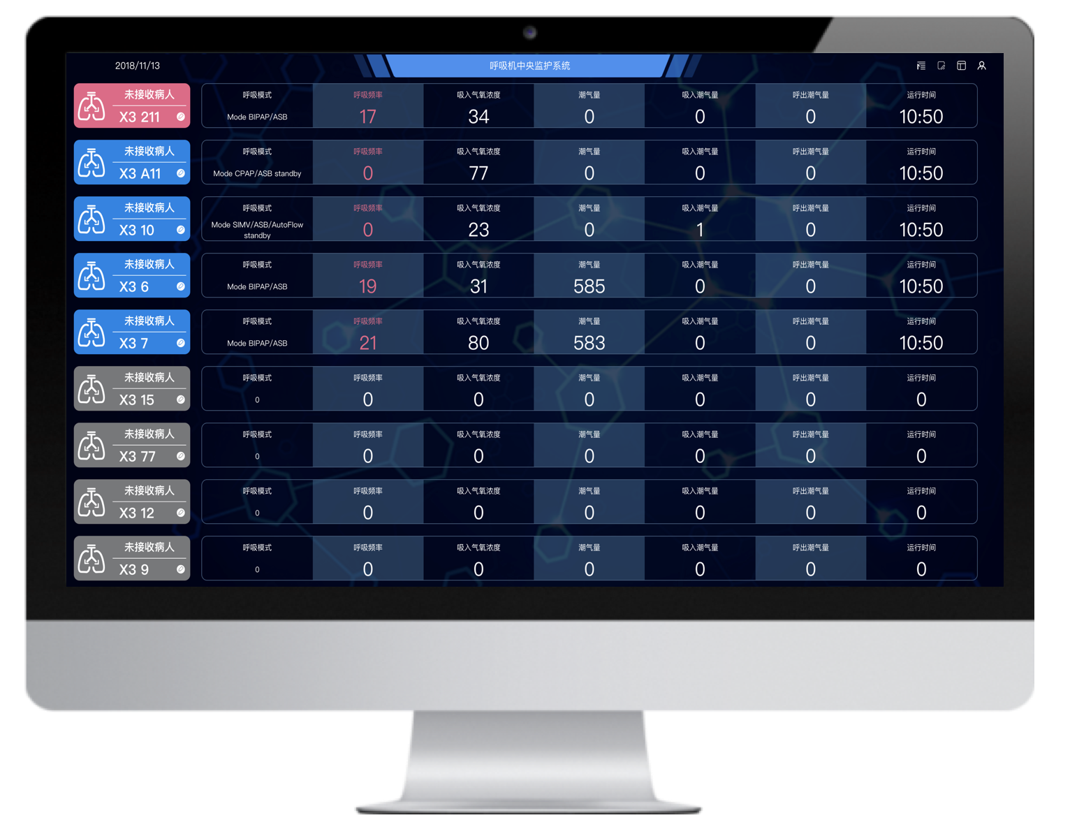 通過的最新的數據采集技術和網絡技術將多臺不同品牌的有創(chuàng)呼吸機聯網,并通過大屏實時集中呈現治療預設參數和監(jiān)測參數,實現多臺集中監(jiān)測、集中管理和數據存儲。